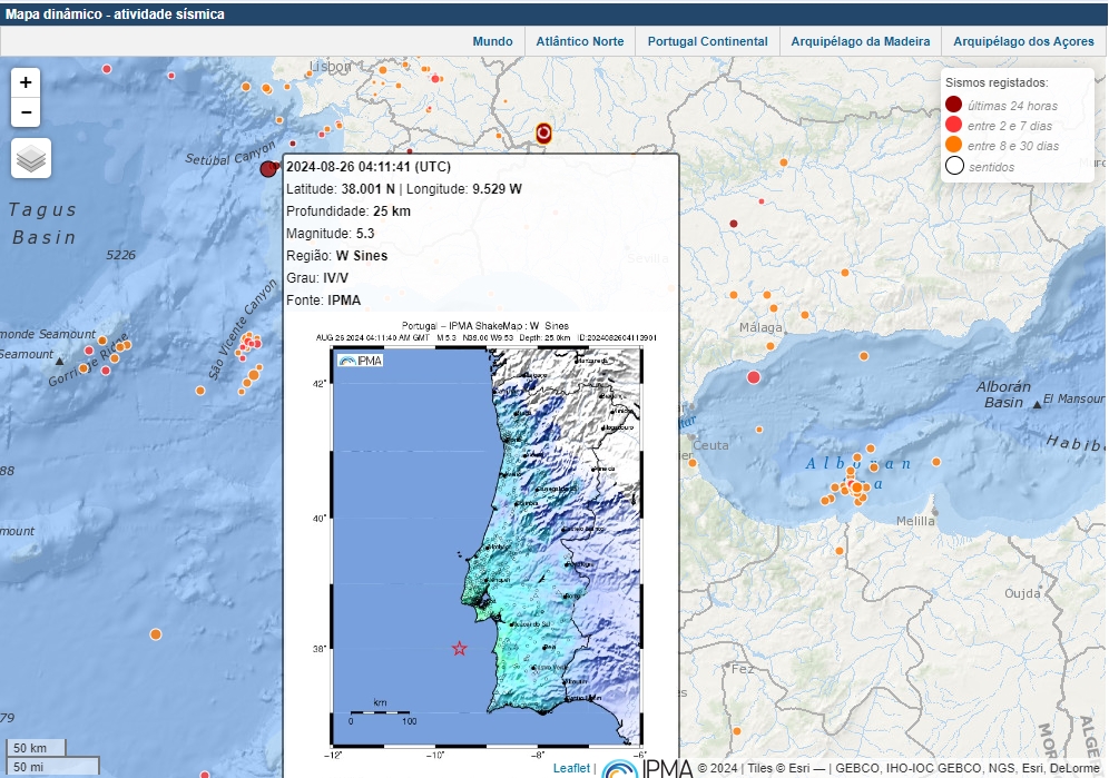 Um sismo de magnitude 5,3 na escala de Richter, com o epicentro localizado a cerca de 60 quilómetros a oeste de Sines, no distrito de Setúbal, foi registado hoje às 05:11, sem causar danos pessoais ou materiais.