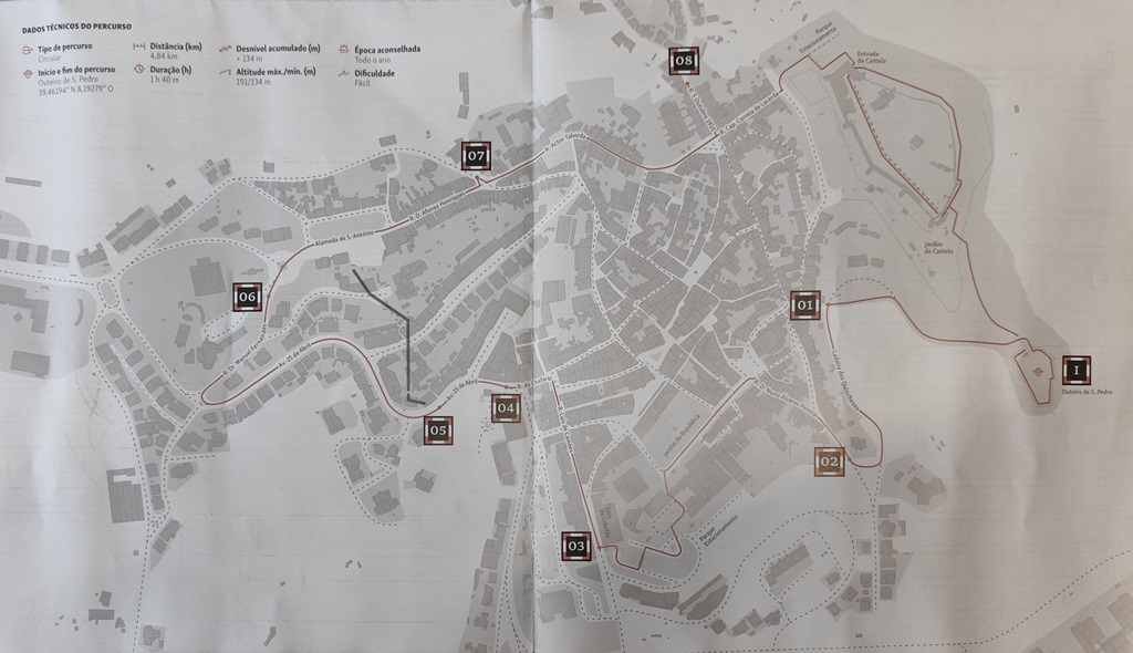 Nota técnica para este novo roteiro de Abrantes. É um percurso circular, com uma distância de 4,84 km, num desnível acumulado de +134 m, a uma altitude de 191/134 metros e de nível de dificuldade fácil. O roteiro tem um tempo de duração previsto de 1h40, deverá iniciar-se no Outeiro de S. Pedro (39,4619 N – 8,19279 O) e poderá fazer-se em qualquer altura do ano.