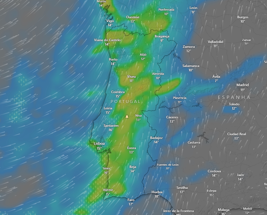 Devido a vento forte, o IPMA também emitiu aviso amarelo para 15 distritos até às 12:00, prolongando-se até às 15:00 no distrito de Faro.