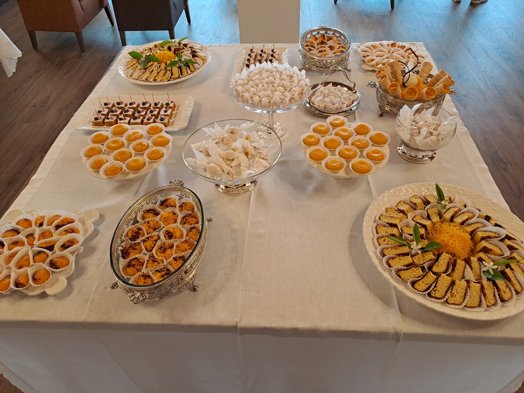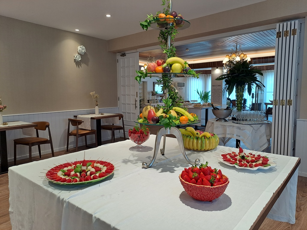Apesar de o espaço interior não estar com o desenho habitual de um dia a servir refeições, para ver o ar refrescado. Se lhes juntarmos a decoração das mesas com as entradas, doces ou fruta, então aí temos a produto final desta intervenção.