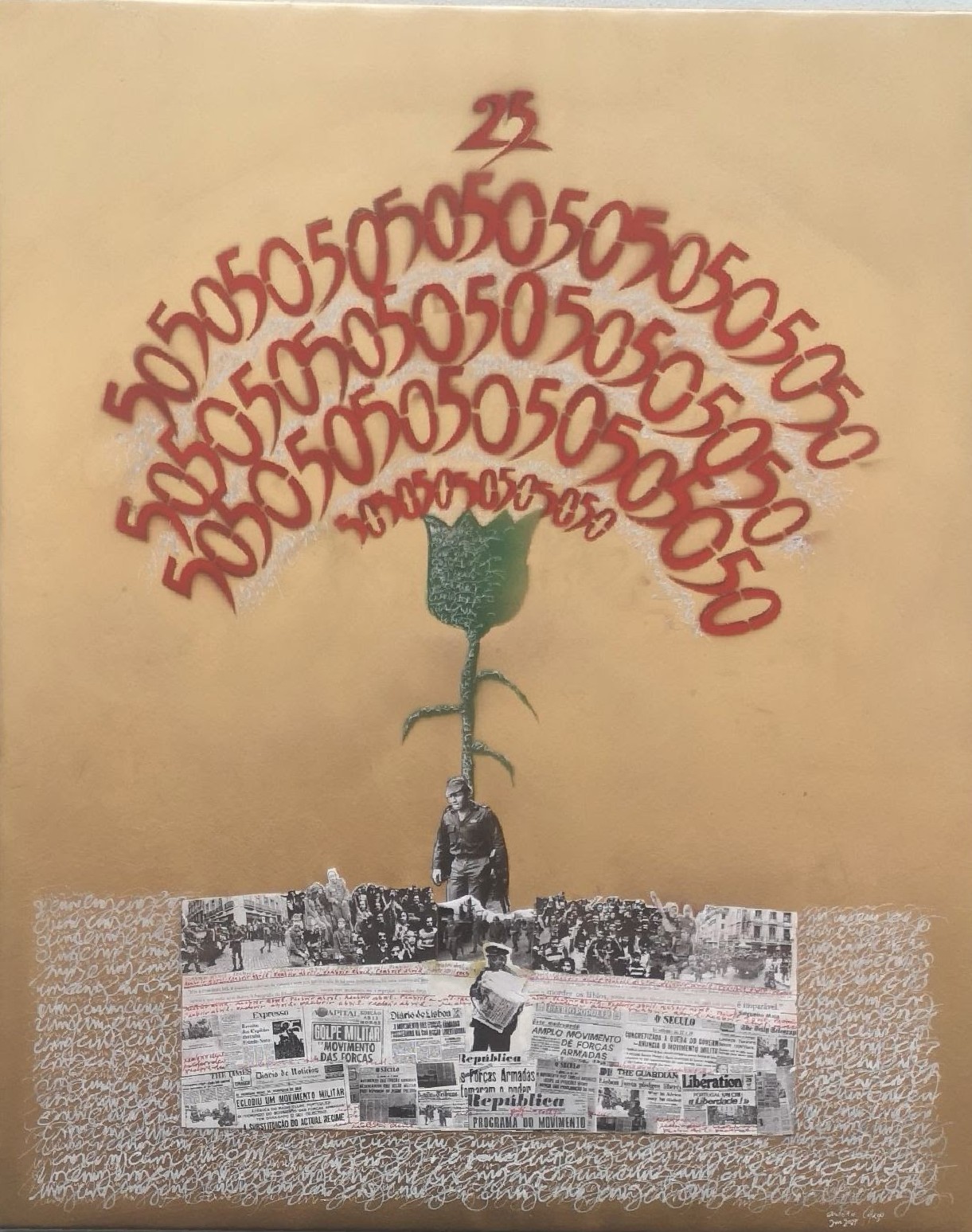 O que faz falta é fazermos o Abril que ainda nos faz falta, enfim, da saúde, da educação, desses temas todos que estão aí mais candentes portanto, uma ideia dinâmica do Abril. Porque o Abril foi um movimento que não quis parar no tempo e, ultimamente, se calhar temos parado no tempo. Do ponto de vista gráfico a ideia surgiu-me em finais do ano passado. Joga com “aquela coisa” do 50, ou seja, é o 50 repetido em diversos graus, e tamanhos, que é a coroa do cravo. Fiz uma tela de 1 metro por 80 cm, à volta disso, e desde logo houve a ideia de oferecer o original à Natércia Maia (viúva de Salgueiro Maia) que já conheço e que já tem, ou o número 1 ou 2 de uma anterior serigrafia que está a ser vendida pela Associação 25 de abril. E porquê a Natércia Maia? Já a conhecendo há algum tempo, tendo entrevistado o marido, para a Rádio Ribatejo, uma ou duas vezes, mas associo-a a alguém que correu riscos, como todos correram riscos naquela gloriosa data. Mas o Salgueiro Maia foi sempre desprendido, nunca ficou deslumbrado. Acho que tipifica, protagoniza o exemplo de alguém.