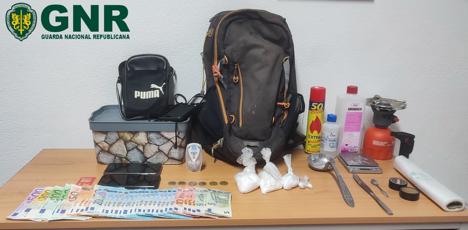 Da ação resultou ainda a apreensão de 635 doses de cocaína, 1700 euros em numerário, uma balança de precisão, dois telemóveis e diverso material usado no acondicionamento do produto estupefaciente.