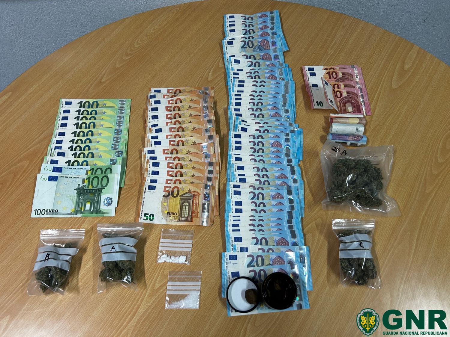 A ação culminou na detenção do suspeito e na apreensão do seguinte material 43 doses de heroína; seis doses de cocaína; 22 doses de canábis; cinco comprimidos de MDMA; 23 artefactos pirotécnicos; e 2.865 euros em numerário.