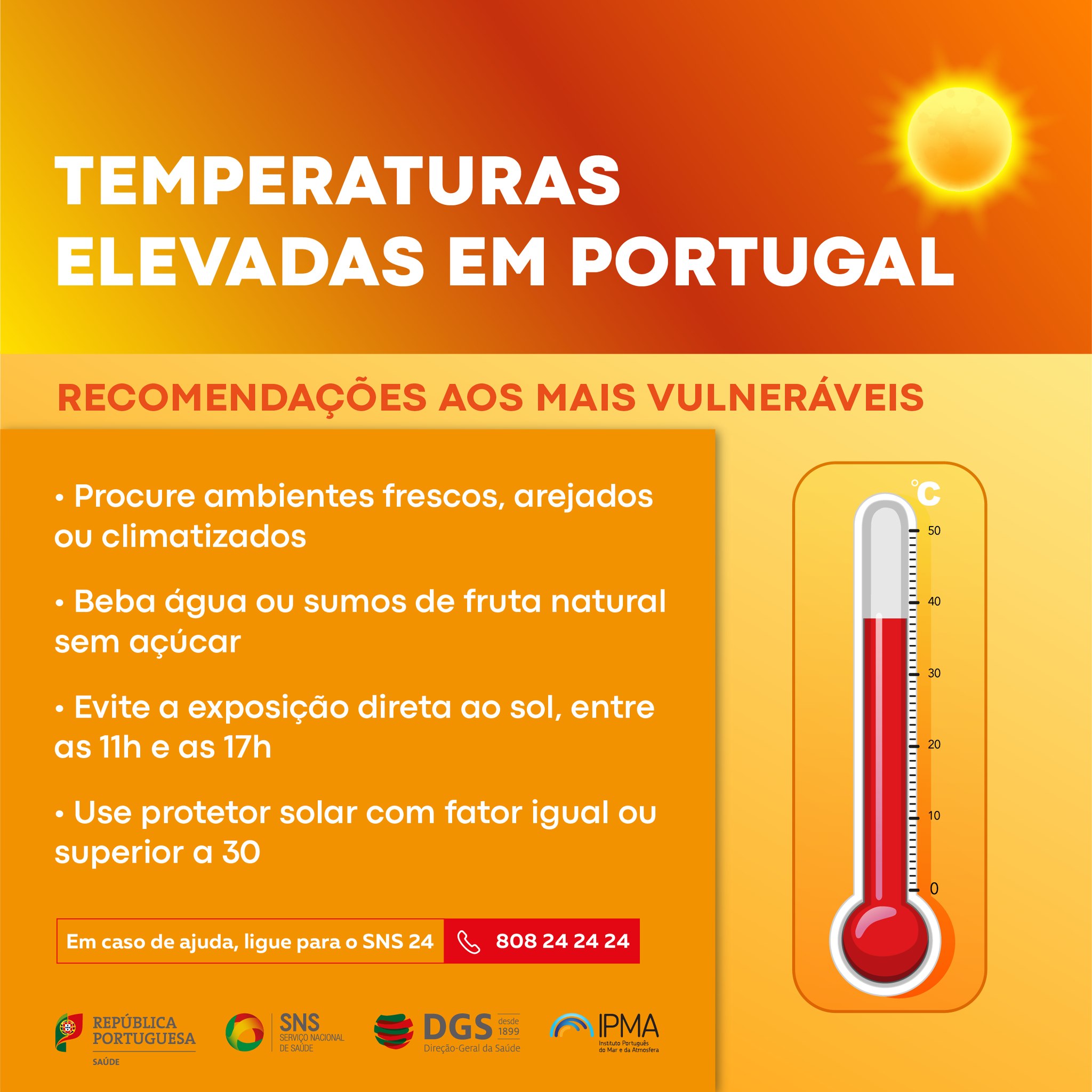 Tendo em conta que o Instituto Português do Mar e da Atmosfera (IPMA) prevê um aumento da temperatura a partir das 09:00 de sexta-feira, podendo as temperaturas máximas ultrapassar os 40°C, o que levou ao agravamento dos Avisos de Tempo Quente para o nível Vermelho nos distritos de Bragança e Vila Real para sexta-feira e sábado, a DGS recomenda medidas de proteção.