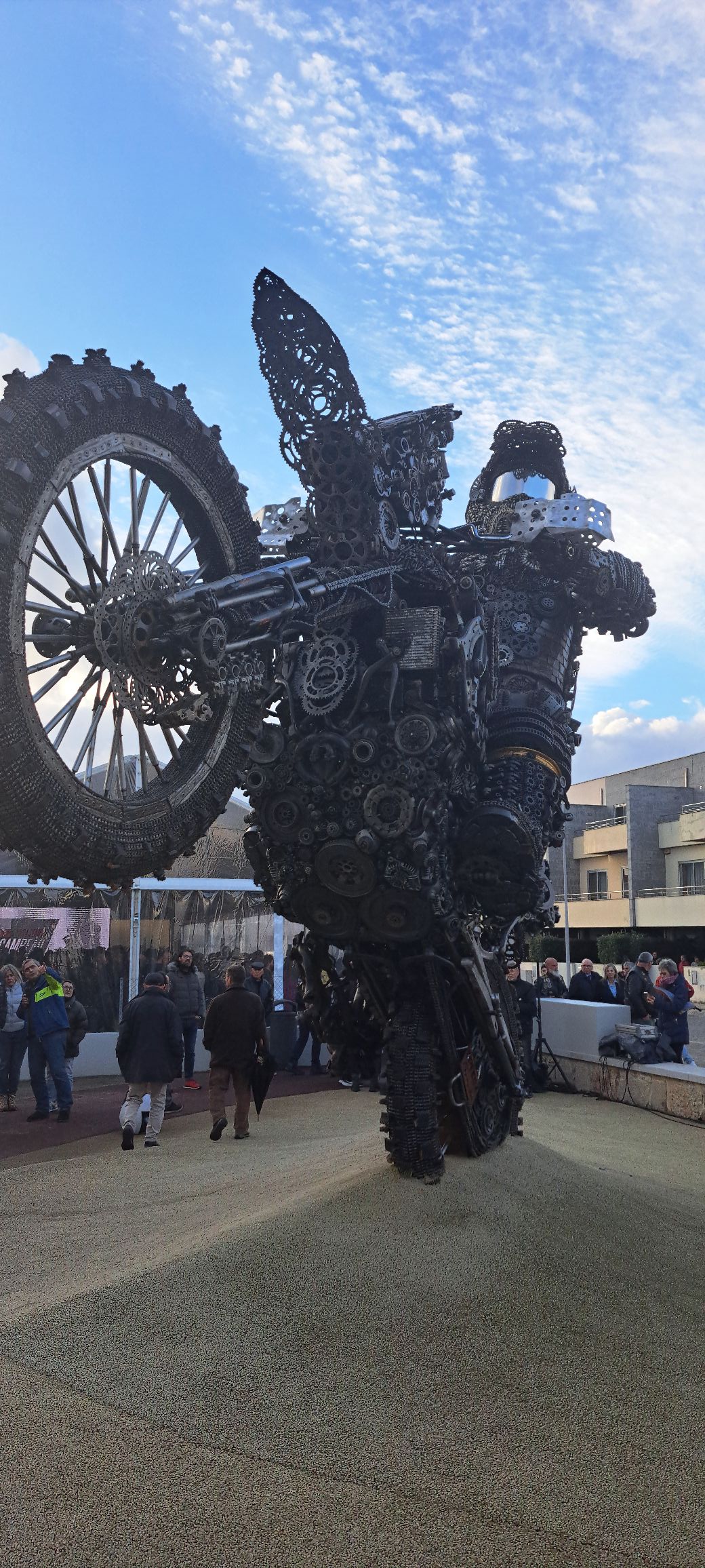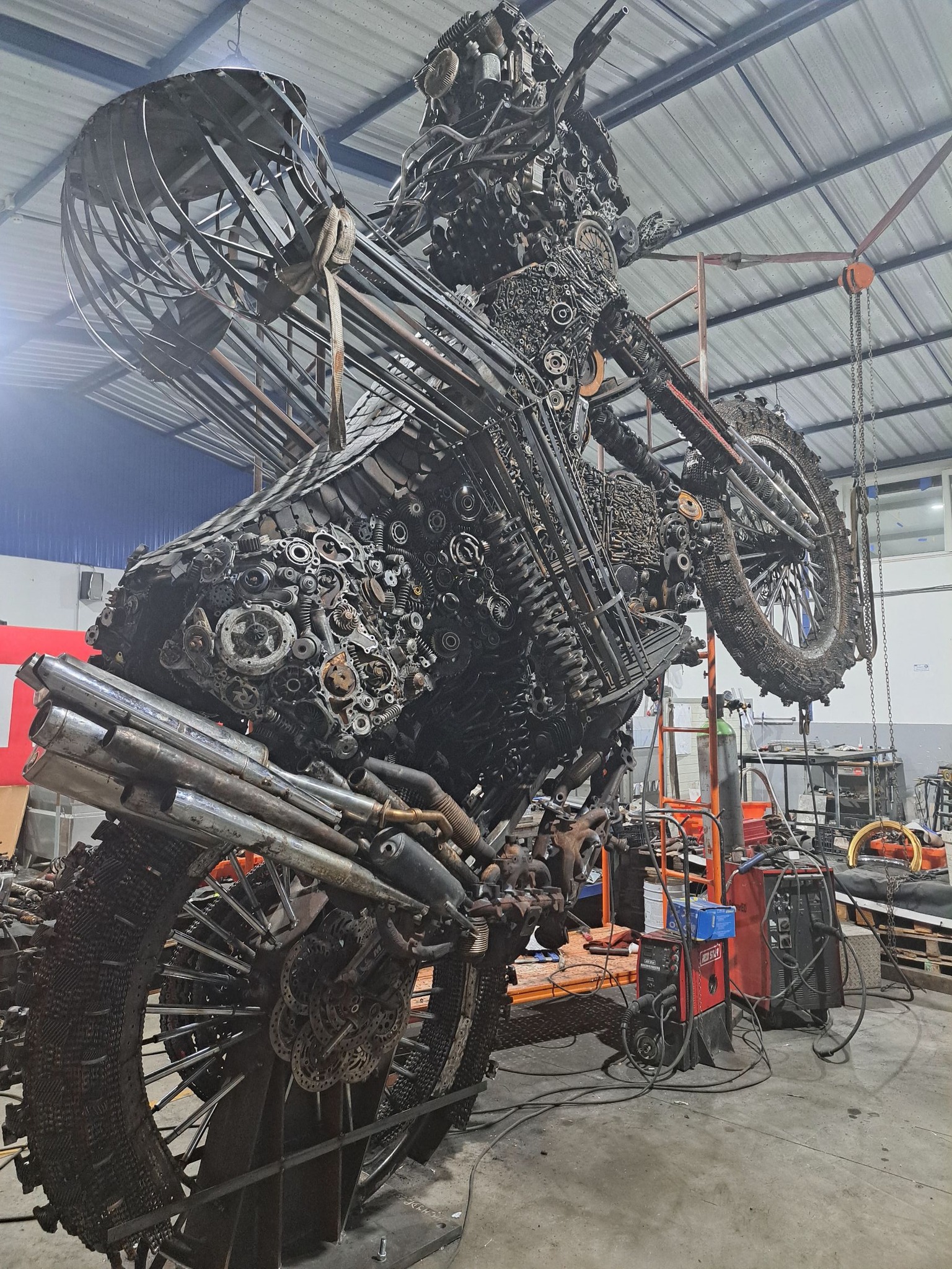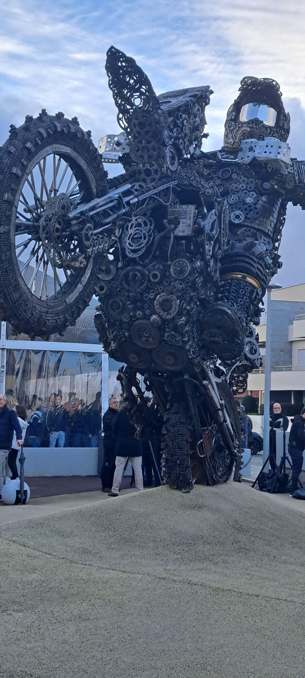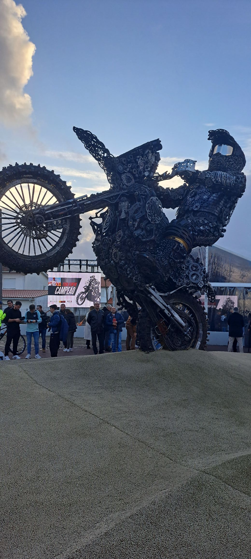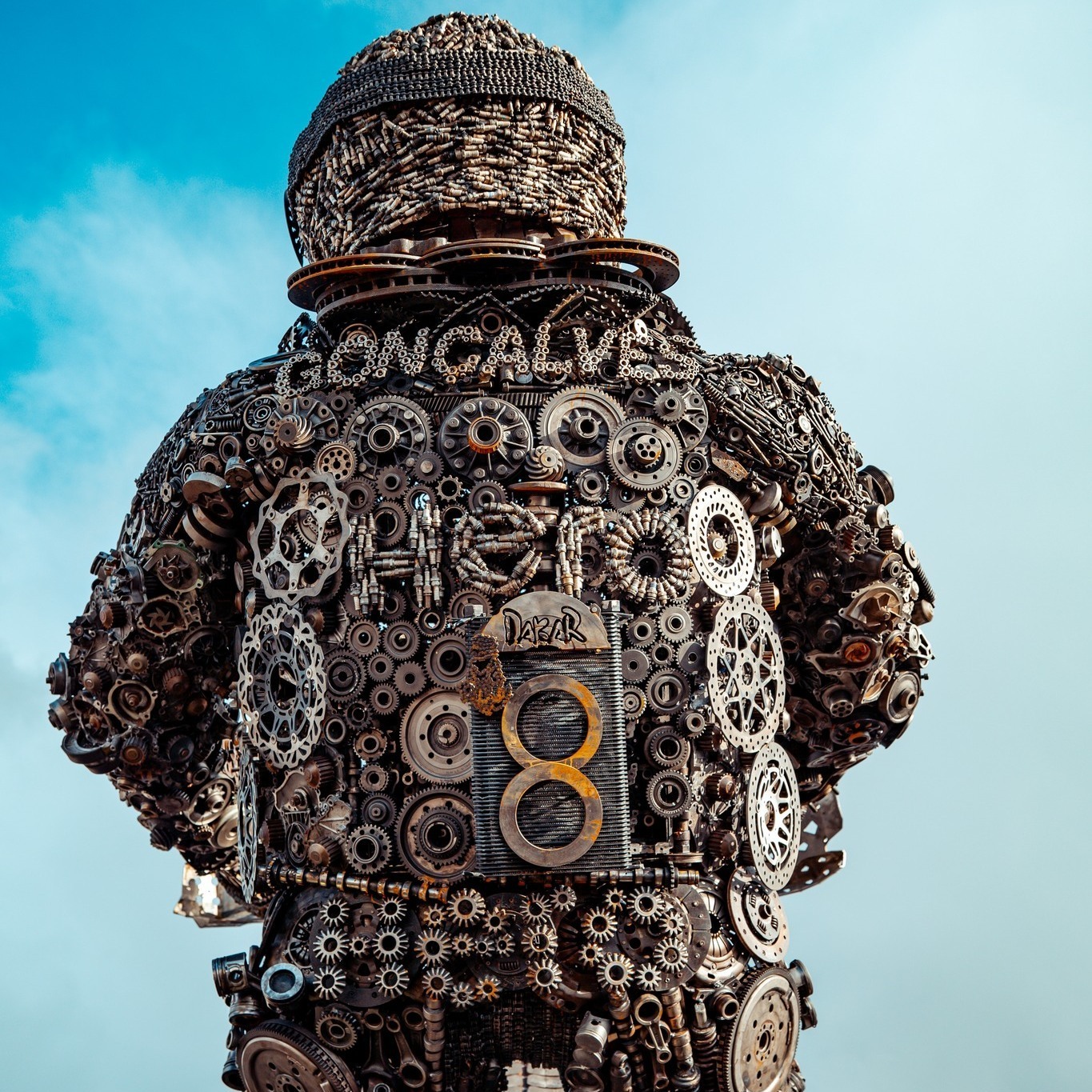 A obra de arte, com mais de cinco metros de altura, e composta por mais de 27.600 peças mecânicas recicladas, retrata o piloto em cima de uma mota, com a roda da frente levantada, numa duna no deserto da Arábia Saudita, onde Paulo Gonçalves viria a morrer, na sequência de um acidente na 42.ª edição do Rali Dakar.