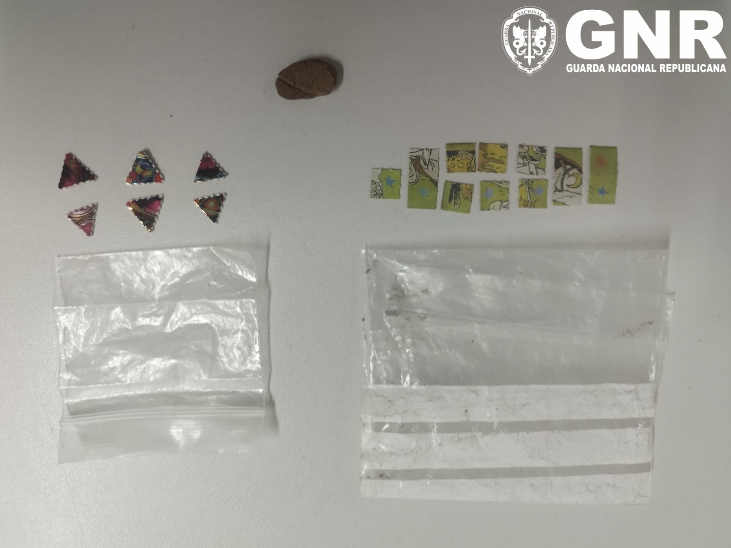 No seguimento da ação policial, foram realizadas revistas pessoais de segurança aos suspeitos, verificando-se que um dos ocupantes tinha na sua posse 19 selos de LSD e uma dose de haxixe, motivo que levou à detenção.