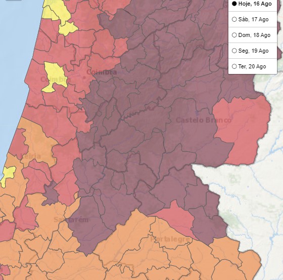 Em risco muito elevado de incêndio estão cerca de uma centena de concelhos nos distritos de Viana do Castelo, Braga, Vila Real, Bragança, Porto, Abeiro, Viseu, Coimbra, Castelo Branco, Leiria, Santarém, Lisboa, Portalegre e Faro.