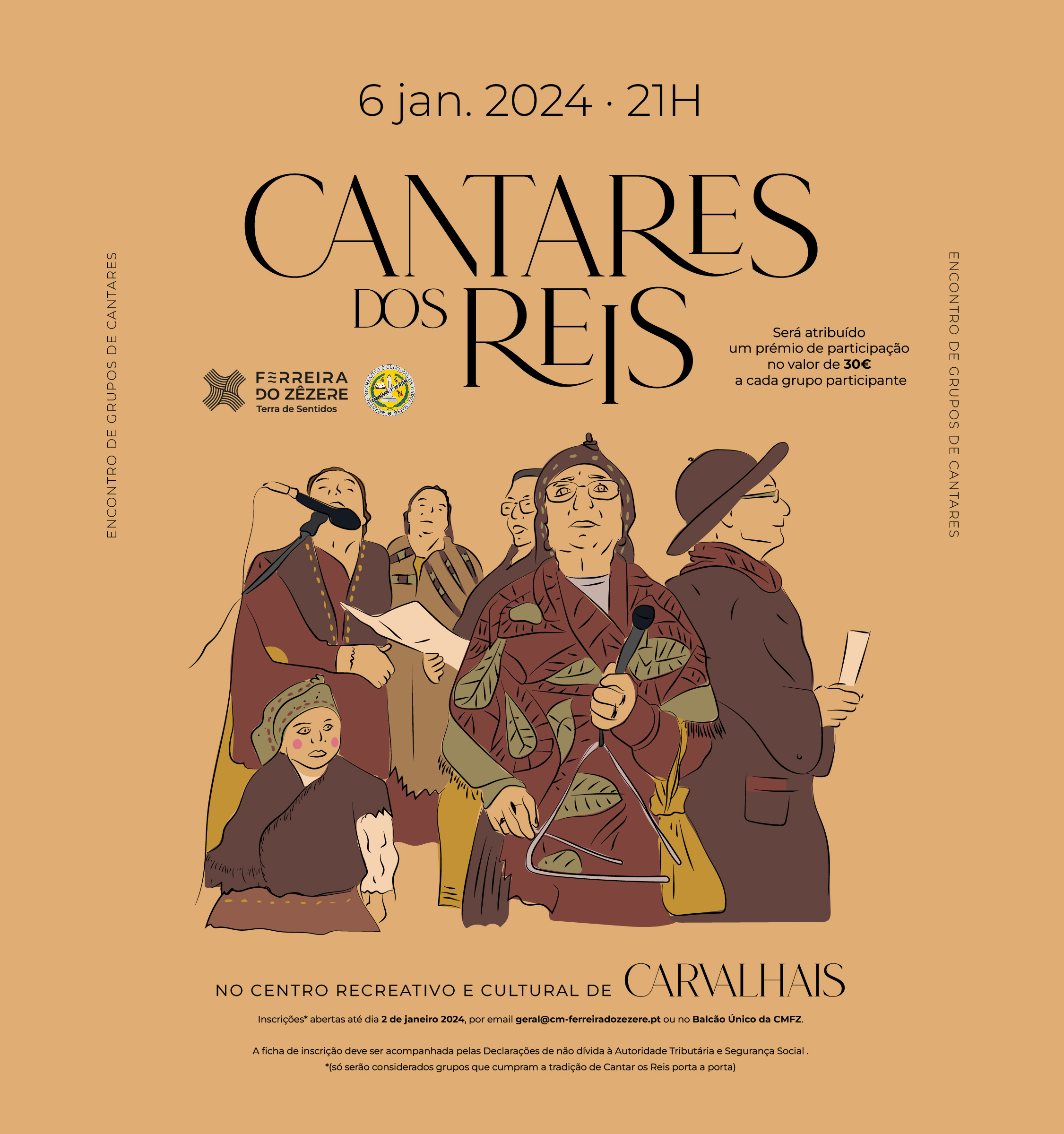 O Município de Ferreira do Zêzere vai promover no dia 6 de janeiro de 2024, sábado, pelas 21h00, no Centro Recreativo e Cultural de Carvalhais, mais uma edição do Encontro de Grupos de Cantar os Reis.