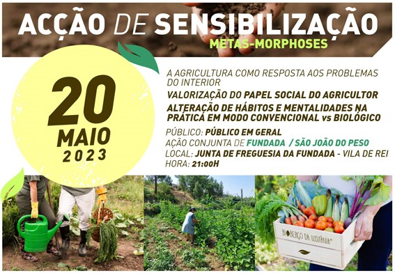 A Junta de Freguesia de Fundada vai receber, pelas 21h00 do próximo sábado, 20 de maio, uma ação de sensibilização do projeto ‘Metas-Morphoses’, numa ação promovida pela Pinhal Maior – Associação de Desenvolvimento do Pinhal Interior Sul, com o apoio do Município de Vila de Rei, e que será uma ação conjunta das Freguesias de Fundada e São João do Peso.