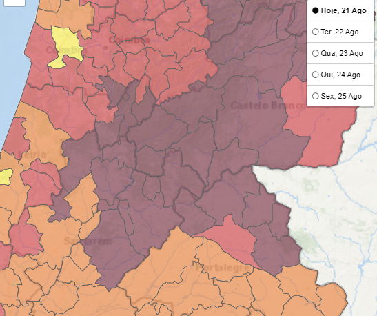 O IPMA colocou também mais de 90 concelhos dos distritos de Faro, Santarém, Portalegre, Castelo Branco, Leiria, Lisboa, Coimbra, Viseu, Guarda, Porto, Aveiro, Viana do Castelo, Braga, Vila Real e Bragança em perigo muito elevado.