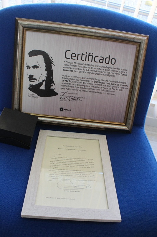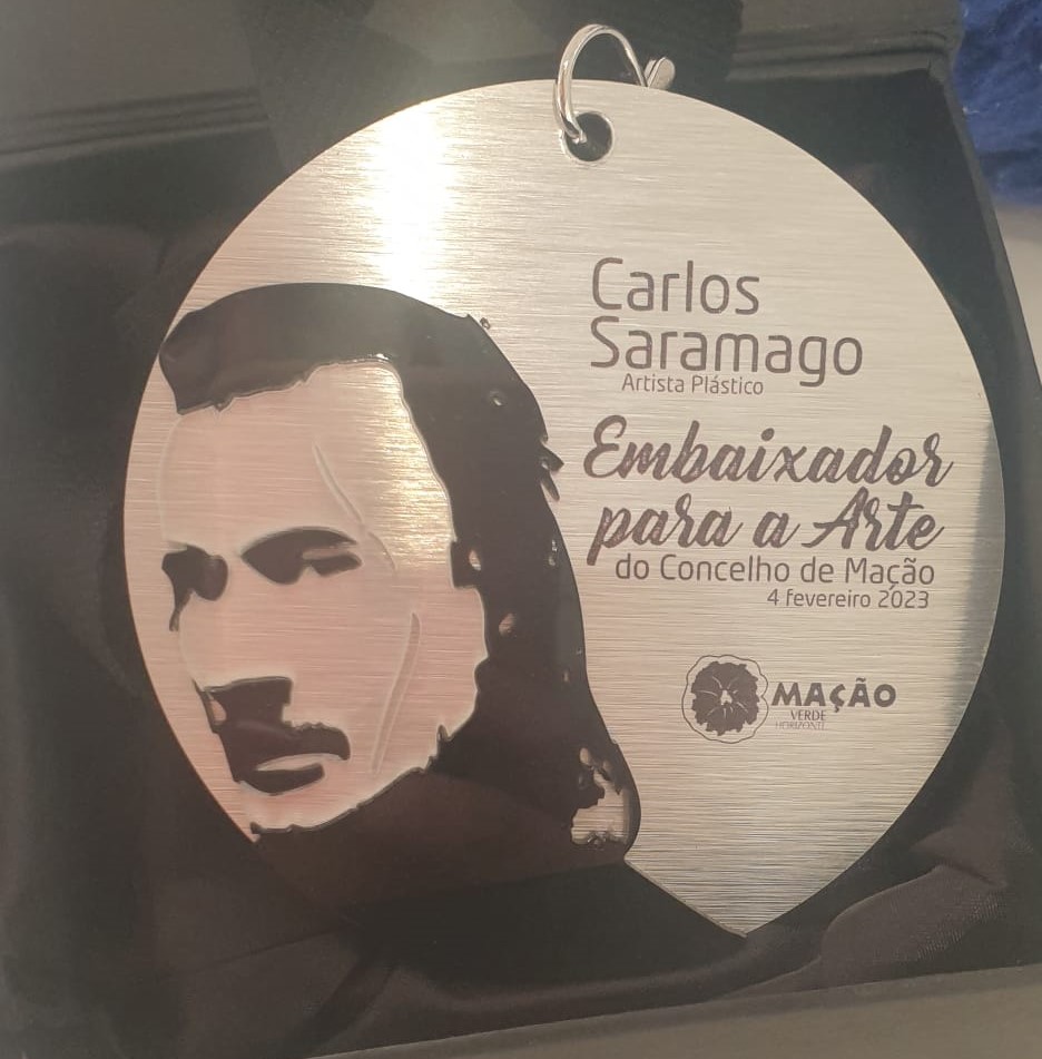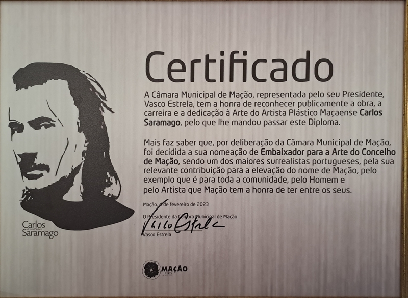 A Câmara Municipal de Mação deliberou igualmente Carlos Saramago “Embaixador para a Arte do Concelho de Mação”. E para assinalar este momento Vasco Estrela entregou ao artista um Certificado com a nomeação, assim como colocou a Medalha ao peito de um, agora muito emocionado, Carlos Saramago.