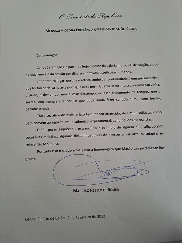 Vasco Estrela leu a carta enviada a Carlos Saramago por Marcelo Rebelo de Sousa em que se dirige de forma muito pessoal e assertiva ao artista e à sua arte, realça o facto de ser autodidata e de enfrentar as sucessivas maleitas com determinação pela forma como se “adapta, reinventa, se supera”. “Por tudo isso”, conclui Marcelo Rebelo de Sousa, “o saúdo e me junto à homenagem que Mação tão justamente lhe presta”.