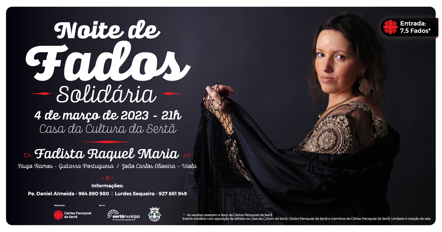 A 4 de março, a Casa da Cultura da Sertã acolhe a “Noite de Fados Solidária” a partir das 21 horas. Promovida pela Cáritas Paroquial da Sertã com o apoio do Município da Sertã, a iniciativa apresentará em palco a fadista Raquel Maria, acompanhada na guitarra portuguesa por Hugo Ramos e na viola por João Carlos Oliveira.
