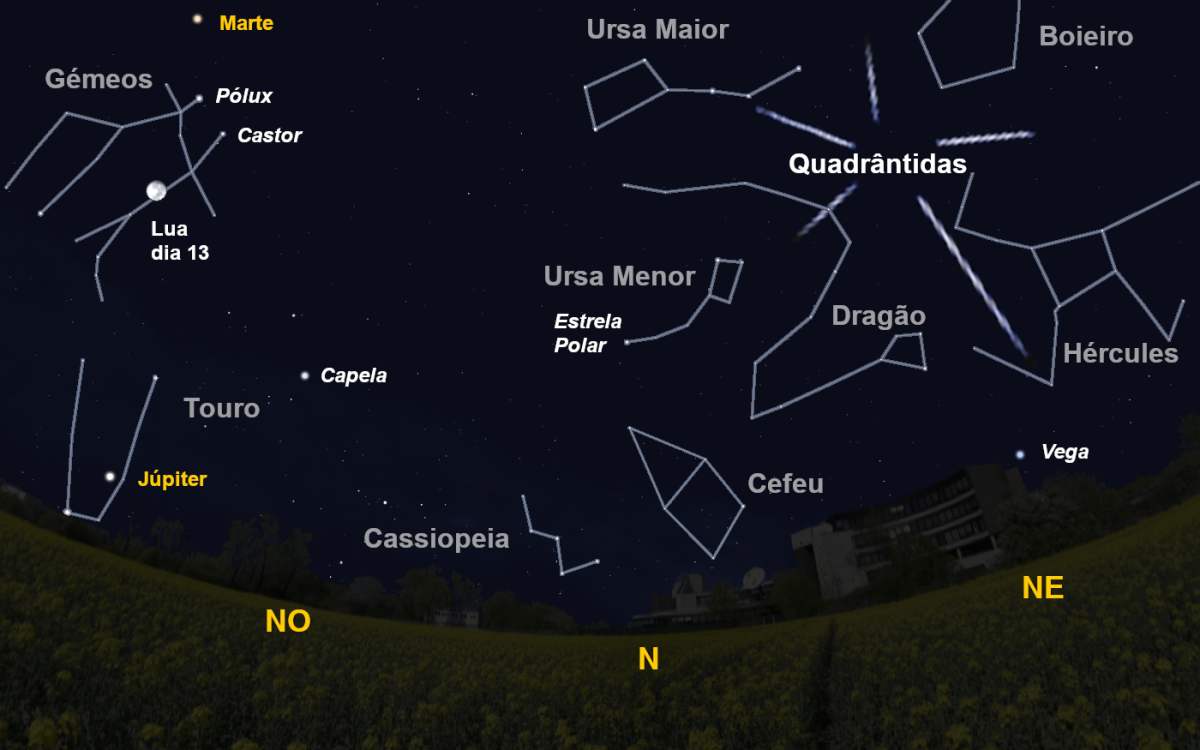 No terceiro dia deste ano, a presença da Lua junto ao planeta Vénus coincide com o pico de atividade da primeira chuva de meteoros do ano: as Quadrântidas. Embora esta chuva de estrelas possa atingir a centena de meteoros por hora, dada a hora a que o pico de atividade terá lugar (meio da tarde), a duração do mesmo (cerca de seis horas), o número de meteoros que chegaremos a observar será dramaticamente inferior. Apesar de poderem ser vistos em qualquer parte do céu, estes pedaços do asteroide 2003 EH1 parecerão ser provenientes de uma mesma região do céu donde outrora se situava a constelação do Quadrante Mural. Esta constelação foi criada em 1795 pelo astrónomo francês Gèrôme Lalande, em homenagem a um instrumento astronómico usado para a medição de ângulos, o qual era montado sobre uma parede alinhada com a direção norte-sul.