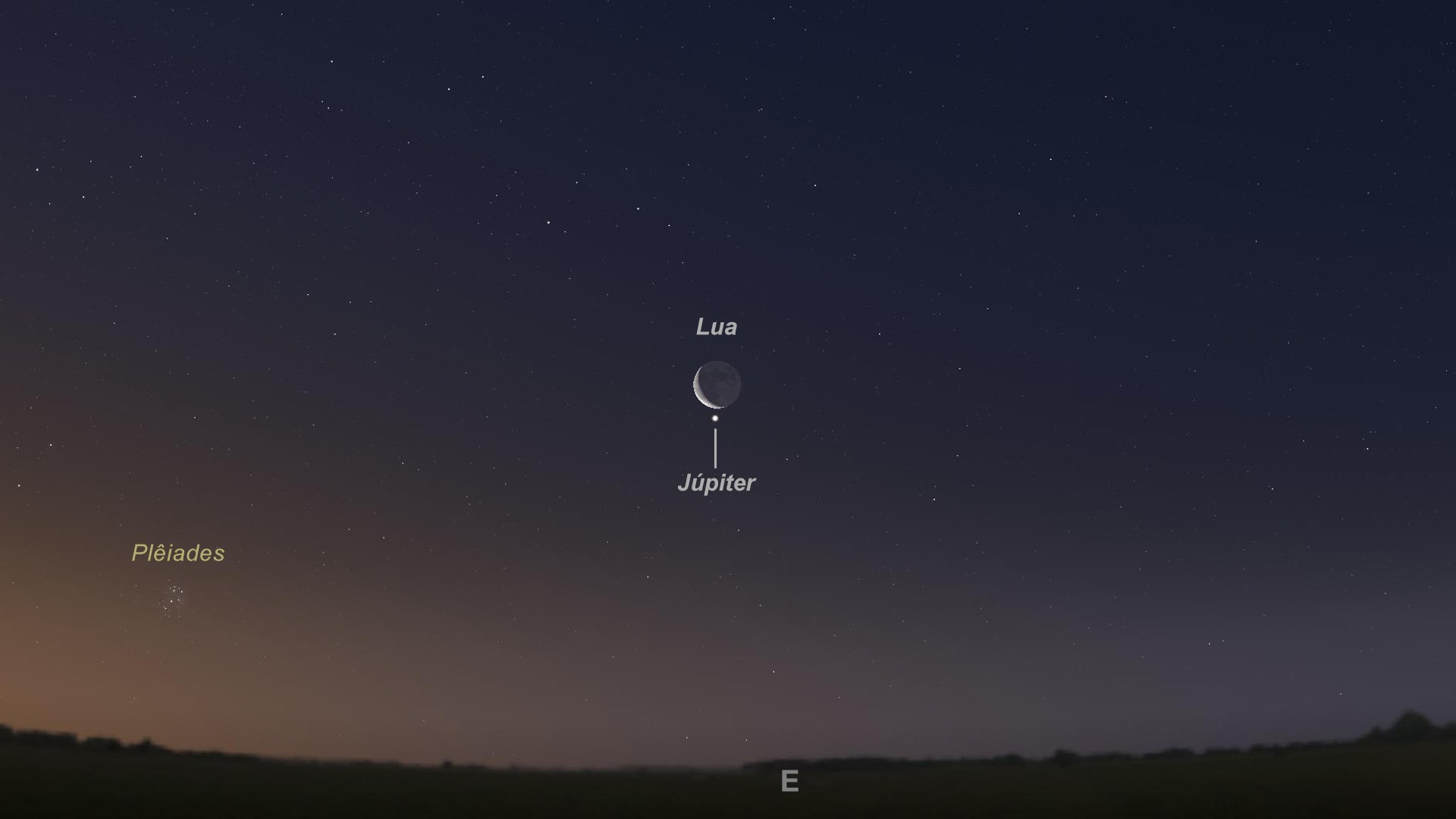 No dia 14, a Lua em minguante passa a cerca de 0,3 graus de Júpiter, ao amanhecer. Um pouco à esquerda destes astros “colados” está o enxame de estrelas das Plêiades, também conhecido em Portugal como o “sete-estrelo”, que este mês começa novamente a ser visível, ao amanhecer. Dois dias depois, um fino minguante da Lua passa cerca de 2 graus abaixo das Plêiades e 6 graus acima do planeta Mercúrio. No dia 17, a Lua está cerca de 6 graus à esquerda deste planeta e no dia seguinte atinge a fase de lua nova.