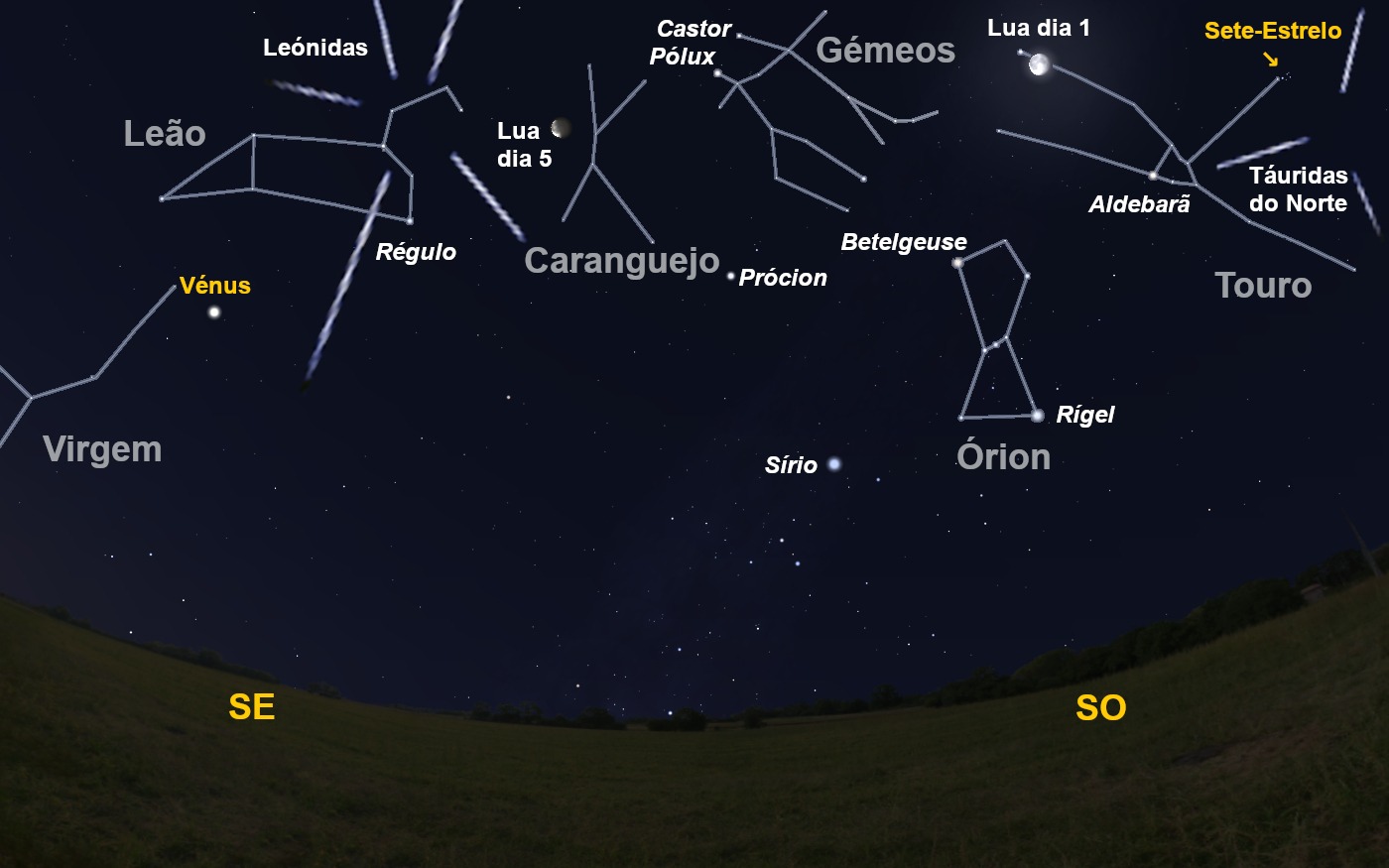 Figura 1: céu a sul pelas seis horas da madrugada de dia um. Igualmente é visível a posição da Lua no dia 5 e os radiantes das chuvas de estrelas Leónidas e Táuridas do Norte