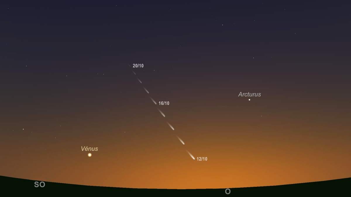 Por essa razão, em princípio o 12 de outubro será o dia ideal para tentar observar o cometa. Neste dia, procurem um local com o horizonte virado a Oeste desimpedido (o topo de um prédio alto, uma praia virada a poente ou uma serra, por exemplo). Por volta das 19h00, quando o Sol passar abaixo do horizonte, procurem o planeta Vénus à esquerda do pôr-do-Sol (a tal “superestrela”). À mesma altura do horizonte e a cerca de um palmo para a direita do planeta, deverão encontrar o cometa, que nas cidades deve parecer uma “manchinha”. Para melhor visualização, podem sempre recorrer a uns binóculos, ou tentar registar a ocasião tirando algumas fotografias de exposição. E, é claro, tentar vê-lo em céus escuros.