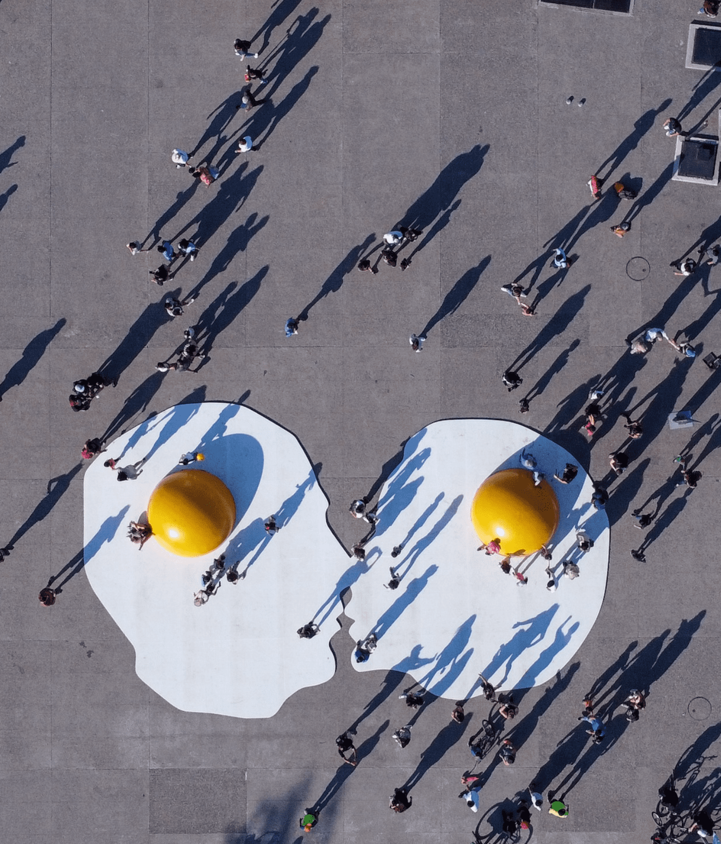 “Eggcident” é uma instalação que já esteve patente em várias cidades do mundo como Roterdão, São Petersburgo, Nova York, Santiago do Chile e Wuhan (China) - agora, estará em Santarém. Uma surpreendente exposição de ovos estrelados gigantes faz a ponte entre o tema da FNA23 - o Ovo - e a problemática das alterações climáticas, também tão relevante para a atividade agrícola. O desafio é imaginarmos que o solo que pisamos ficaria tão quente que poderia fritar um ovo... E rapidamente concluirmos que um mundo assim, não é viável. Nas palavras do artista estes ovos estrelados são simultaneamente um aviso e um sinal de esperança. Alerta-se que estamos a destruir o planeta e a biodiversidade, que ainda não entendemos que temos apenas um lar: a terra. Por outro lado, estes ovos em forma de rosto humano que se beijam entre si representam a esperança numa nova vida, num futuro brilhante para a próxima geração.