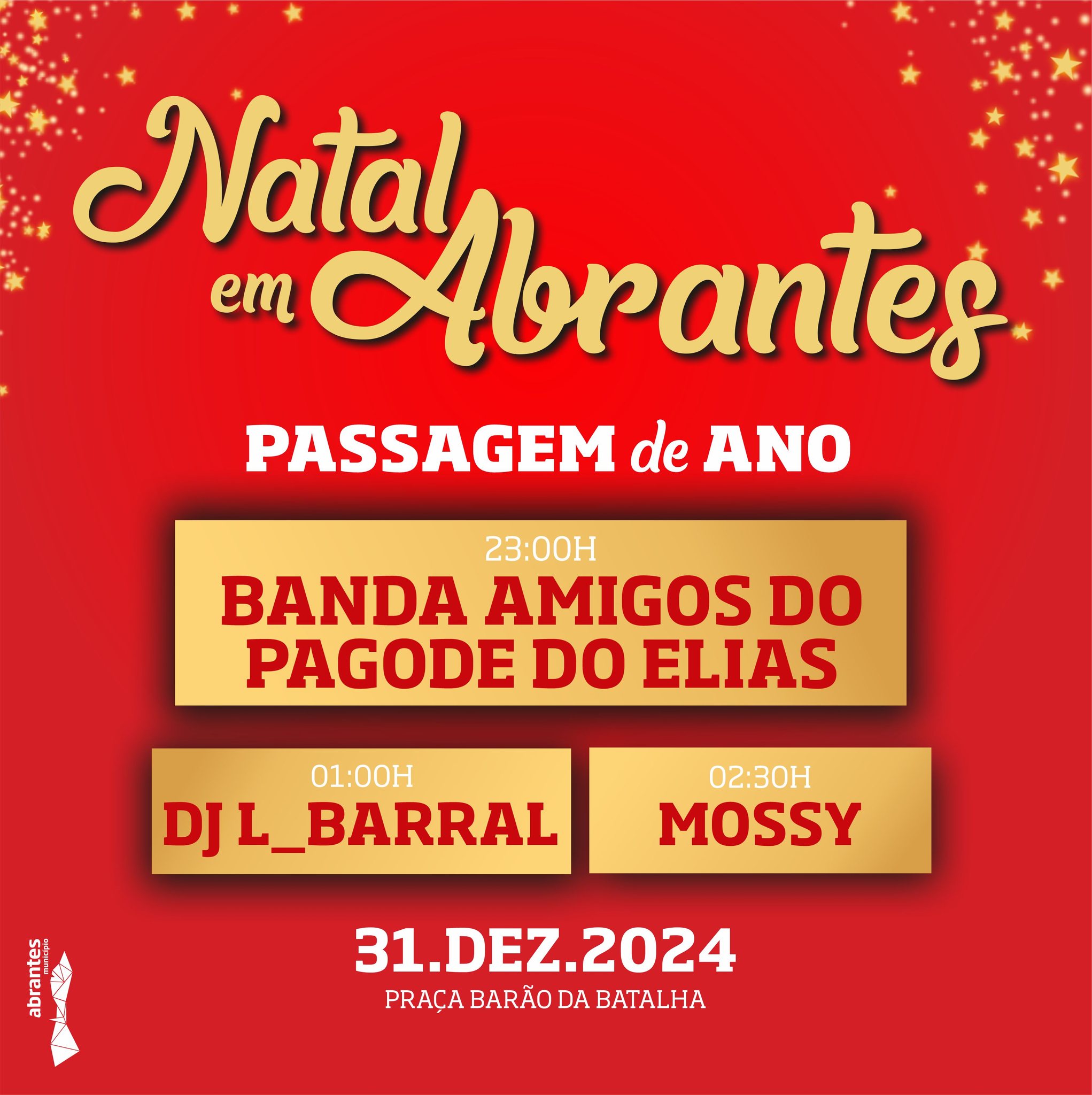 A Passagem de Ano está agendada para a Praça Barão da Batalha a partir das 23 horas, com a animação musical a cargo do grupo “Banda Amigos do Pagode do Elias”. A partir da 1h00, a música segue com o DJ L_Barral e Mossy.