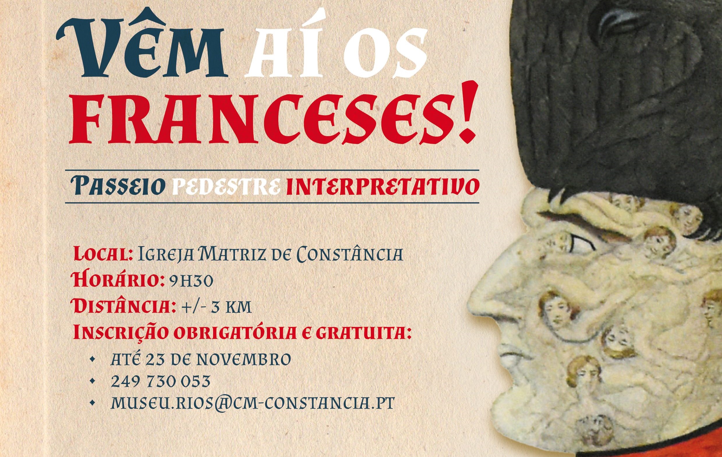 «Vêm aí os franceses!» é um passeio pedestre interpretativo pela vila de Constância, numa distância de cerca de 3 km, com grau de dificuldade fácil e uma duração prevista de 3 horas, cujo ponto de encontro está agendado para o largo da Igreja Matriz de Constância no dia 25 de novembro.