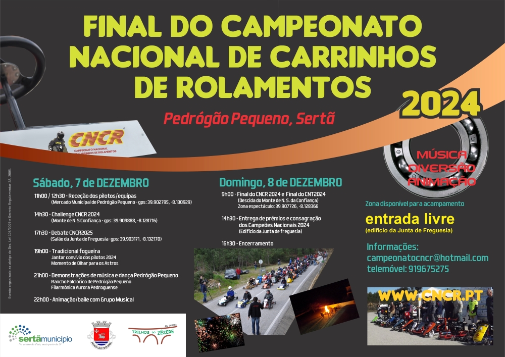 Promovida pela Trilhos do Zêzere, com o apoio do Município da Sertã, esta iniciativa tem início no dia 7 de dezembro, sábado, com a receção dos pilotos e equipas no Mercado Municipal de Pedrógão Pequeno. Pelas 14h30, o Monte de Nª. Srª. da Confiança, será palco do Challenge CNCR 2024, momento que promete emoção e adrenalina, quando dezenas de pilotos deslizarem os seus carrinhos de rolamentos pela desafiante descida. Além de evocar tempos recuados de infâncias de outrora, a iniciativa irá testar a perícia e habilidade dos participantes e, decerto, fazer as delícias do público.