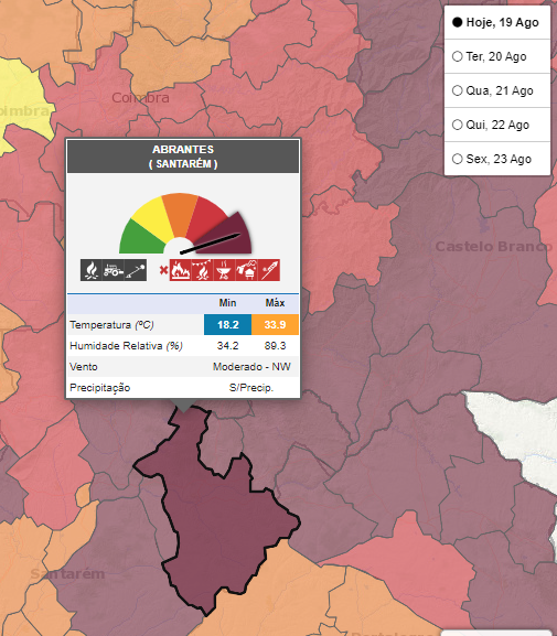 Em perigo máximo de incêndio estão mais de 40 concelhos dos distritos de Santarém, Faro, Portalegre, Castelo Branco, Guarda, Viseu e Bragança. Na região Abrantes, Barquinha, Chamusca, Constância, Mação, Ferreira do Zêzere, Tomar, Sardoal, Vila de Rei, Sertã, Proença-a-Nova, Gavião e Nisa estão neste nível máximo.