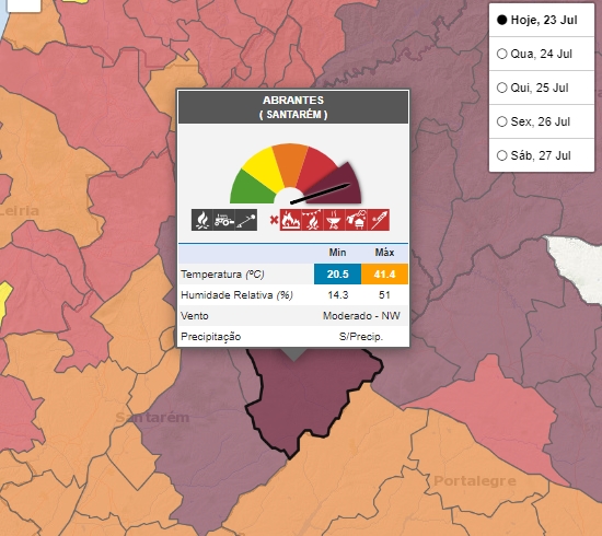 Em perigo máximo de incêndio estão cerca de 50 concelhos dos distritos de Faro, Portalegre, Castelo Branco, Viseu, Santarém, Bragança, Vila Real e Guarda. Na região do Médio Tejo Abrantes, Constância, Barquinha, Ferreira do Zêzere, Mação Sardoal e Tomar estão no risco máximo. Junta-se neste risco o concelho de Chamusca, Gavião, Nisa, Sertã, Oleiros, Vila de Rei, Proença-a-Nova e Vila Velha de Ródão.