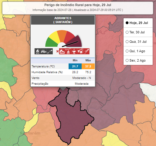 Os mais de 40 concelhos em risco máximo pertencem aos distritos de Faro, Santarém, Portalegre, Castelo Branco, Guarda, Viseu, Vila Real e Bragança, de acordo com o Instituto Português do Mar e da Atmosfera (IPMA). Na região estão no risco máximo Abrantes, Mação, Sardoal, Vila de Rei, Proença-a-Nova, Gavião, Nisa e Vila Velha de Ródão.
