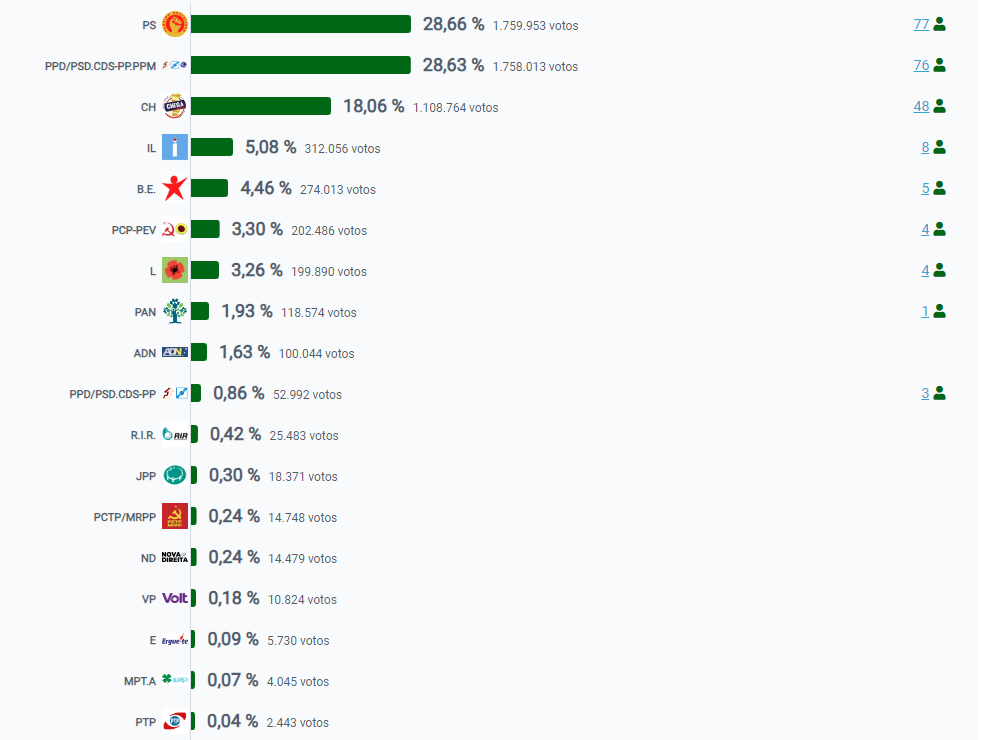 Em terceiro lugar, ficou o Chega, com 18,06% dos votos e 48 eleitos, seguindo-se a IL com 5,08% e oito deputados, o BE, com 4,46% e cinco eleitos, a CDU, que com 3,30% elegeu quatro deputados do PCP, o Livre, com 3,26% e também quatro deputados, e o PAN, com 1,93% e um deputado.