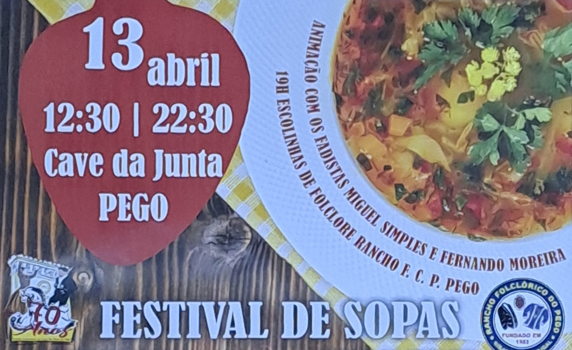 A partir das 12H30 de dia 13 de abril, é na cave da Junta de Freguesia do Pego que os convivas poderão degustar as 31 sopas disponíveis. A entrada, com um custo de oito euros, inclui a tigela, o pão e as bebidas, para além das sopas que conseguir provar.