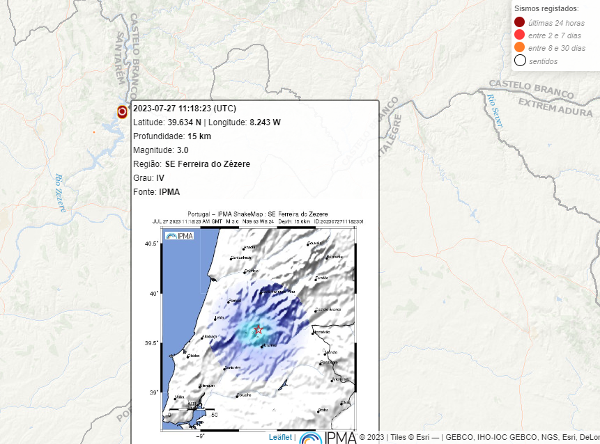 O Instituto Português do Mar e da Atmosfera (IPMA) registou hoje, às 12:18, um sismo de magnitude 3,0, na escala de Richter, com epicentro a cerca de oito quilómetros a Sudeste de Ferreira do Zêzere, no distrito de Santarém.