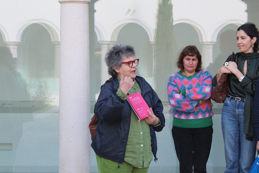 Ainda nos claustros do Convento de S. Domingos estão duas peças e deverá ser por aí o início da exploração ao trabalho das 20 artistas. Mas pode, também, apontar ao final. É que uma das peças, de Luísa Cunha, de 2006/2007, é um banco de jardim que tem uns auscultadores e permite que duas pessoas se sentem e possam “navegar no trabalho “Words for Gardens”. Trata-se de uma obra em áudio, um trabalho imaterial e que contou com as explicações da própria artista.