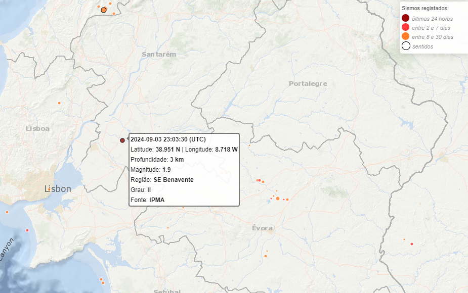 Um sismo de magnitude 1,9 na escala de Richter foi hoje sentido no concelho de Benavente, no distrito de Santarém, sem causar danos pessoais ou materiais, segundo o Instituto Português do Mar e da Atmosfera (IPMA).