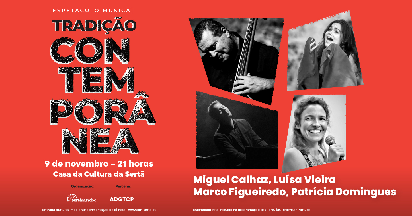 “Tradição Contemporânea” acontece dia 9 de novembro às 21 horas, na Casa da Cultura da Sertã, com entrada gratuita, mediante apresentação de bilhete, que deverá ser previamente levantado na Casa da Cultura da Sertã.