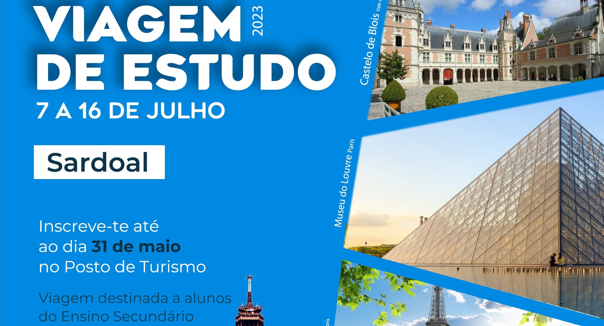 Os alunos sardoalenses visitarão, entre outros locais de interesse, o Castelo de Blois, o Museus do Louvre, o Rio Sena, a Torre Eiffel e o famoso parque temático da Eurodisney.