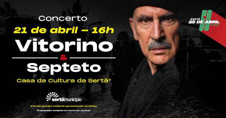 Este domingo, dia 21 de abril, a Casa da Cultura da Sertã vai ser palco do concerto de Vitorino e Septeto, às 16 horas. Neste ano em que se celebram os 50 anos do 25 de Abril, Vitorino percorre o país para celebrar a conquista da Liberdade, sendo uma das vozes que, antes e após 1974, a cantou.