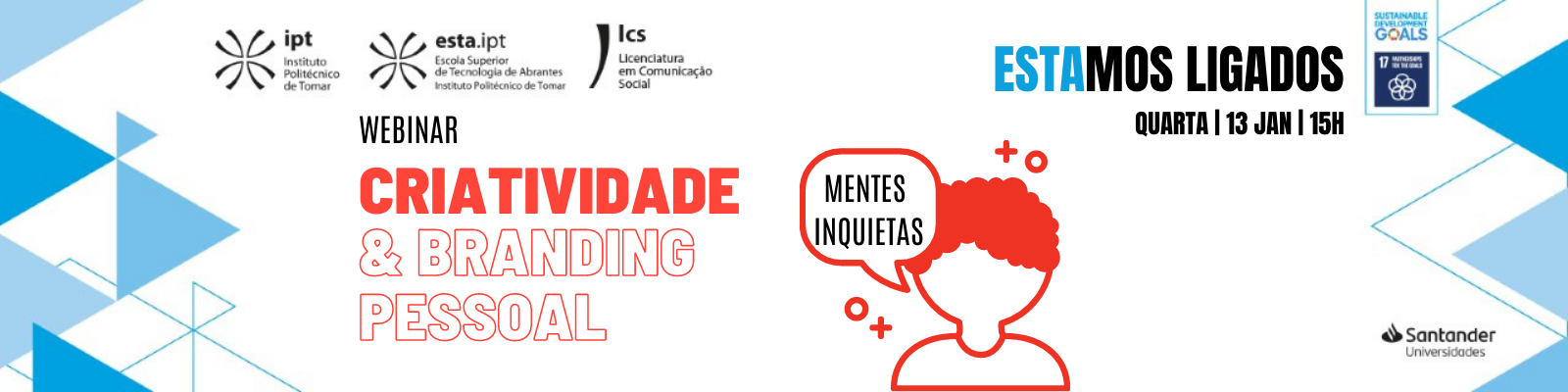 No próximo dia 13 de janeiro, quarta-feira, tem início o “ESTAmos Ligados”, um conjunto de webinares com a duração de uma hora, realizados pelas alunas de terceiro ano da licenciatura em Comunicação Social, vertente de Comunicação Empresarial na Escola Superior de Tecnologia de Abrantes: o ESTAmos Ligados! Este evento, totalmente online, será composto por três webinars com temáticas distintas, sendo o primeiro já no próximo dia 13 (quarta-feira), o segundo, dia 15 (sexta-feira) e o terceiro e último no dia 20 de janeiro (quarta-feira), todos sempre às 15 horas. Os temas são “Criatividade & Branding Pessoal”, “Humor na Comunicação e Produtividade nas Empresas“ e “Blind Date, Blind Data”, respetivamente.