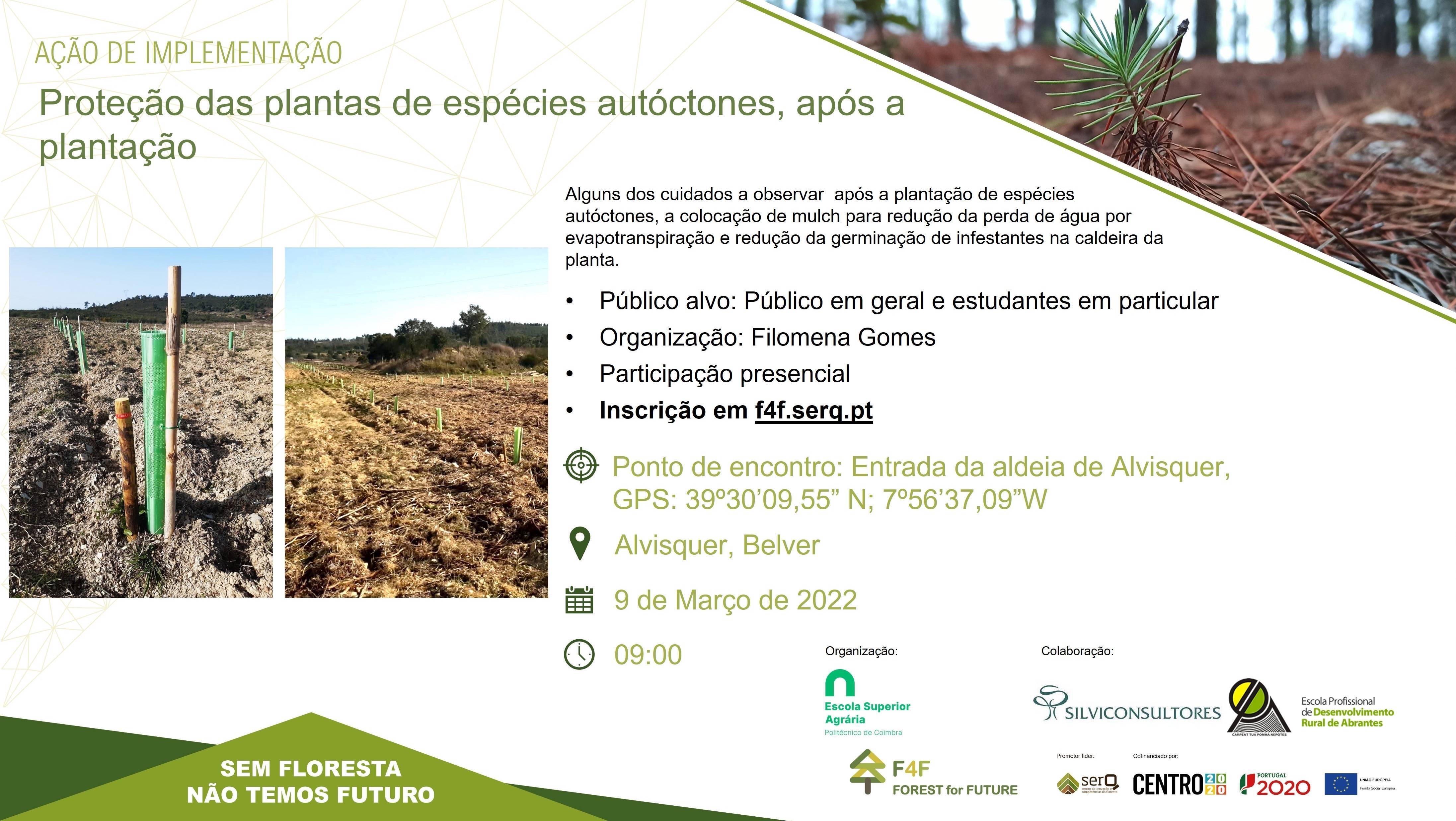 A organização desta ação, destinada ao público em geral e a estudantes em particular, é da responsabilidade da professora da ESAC-IPC, Filomena Gomes. A ação, com início às 09h00, consistirá na colocação de mulch para redução da perda de água por evapotranspiração e redução da germinação de infestantes na caldeira da planta, e tem por objetivo a transferência de conhecimento sobre alguns dos cuidados a observar após a plantação de espécies autóctones.
