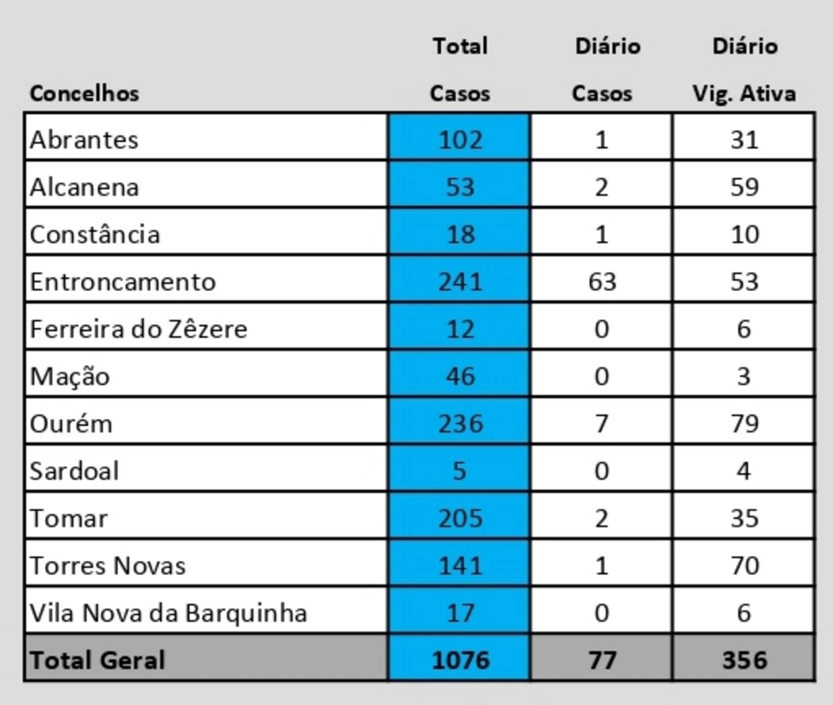 Segundo a Câmara do Entroncamento o concelho tem um total de 182 casos COVID-19, dos quais 76 são ativos, 99 recuperados e 7 óbitos. O concelho do Entroncamento tinha esta terça-feira 53 casos em vigilância ativa.