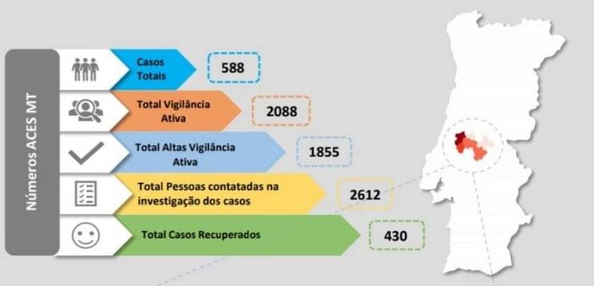 No total, o território dos 11 concelhos que fazem parte da Unidade de Saúde Pública do Médio Tejo tem o valor acumulado de 588 casos positivos.