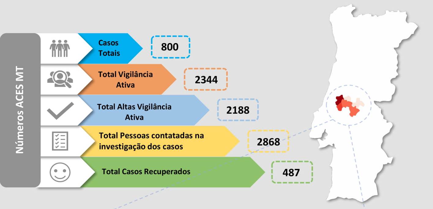 No que diz respeito às vigilâncias ativas o número total é de 199, uma diminuição em relação aos dados desta quinta-feira. Estas vigilâncias são contactos de infetados em Abrantes (14), Alcanena (29), Constância (1), Entroncamento (50), Ferreira do Zêzere (1), Mação (2), Ourém (41), Tomar (24), Torres Novas (26) e Vila Nova da Barquinha (11). De registar que o Sardoal é, nesta sexta-feira, o único concelho do ACES Médio Tejo sem qualquer pessoa em isolamento profilático.
