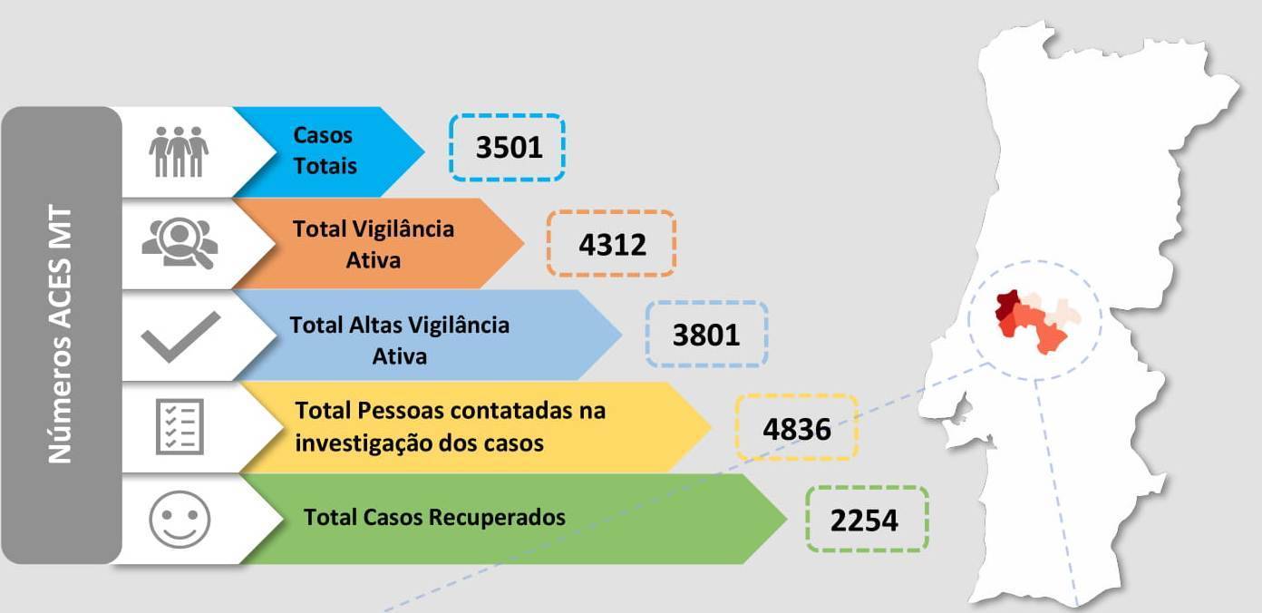 Esta quinta-feira há 553 pessoas em vigilância ativa por terem tido contactos próximos e diretos com infetados. Estas pessoas, que devem ficar em isolamento os 14 dias, estão localizadas em Abrantes (64), Alcanena (27), Constância (3), Entroncamento (56), Ferreira do Zêzere (4), Mação (13), Ourém (118), Sardoal (5), Tomar (149), Torres Novas (73) e Vila Nova da Barquinha (41).