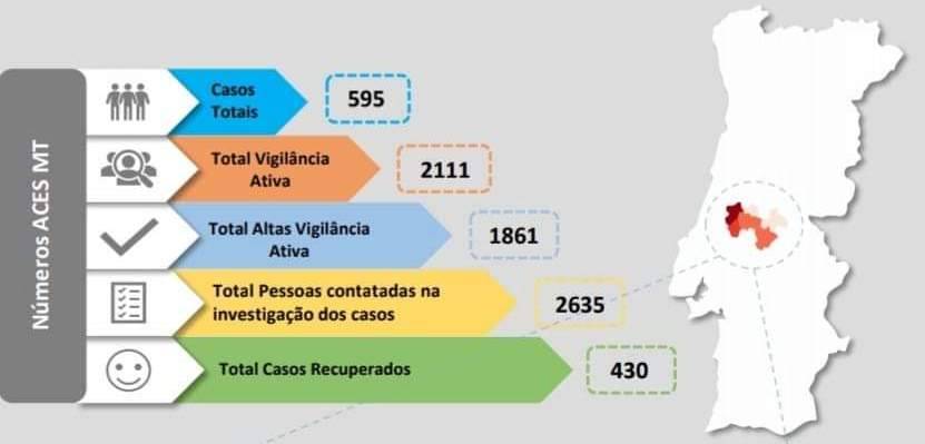 No que diz respeito aos recuperados, são neste momento 430. A saúde pública do Médio Tejo tem recuperados com alta clínica em Abrantes (42), Alcanena (20), Constância (3), Entroncamento (49); Ferreira do Zêzere (8), Mação (9), Ourém (116), Sardoal (1), Tomar (134), Torres Novas (50) e Vila Nova da Barquinha (7).