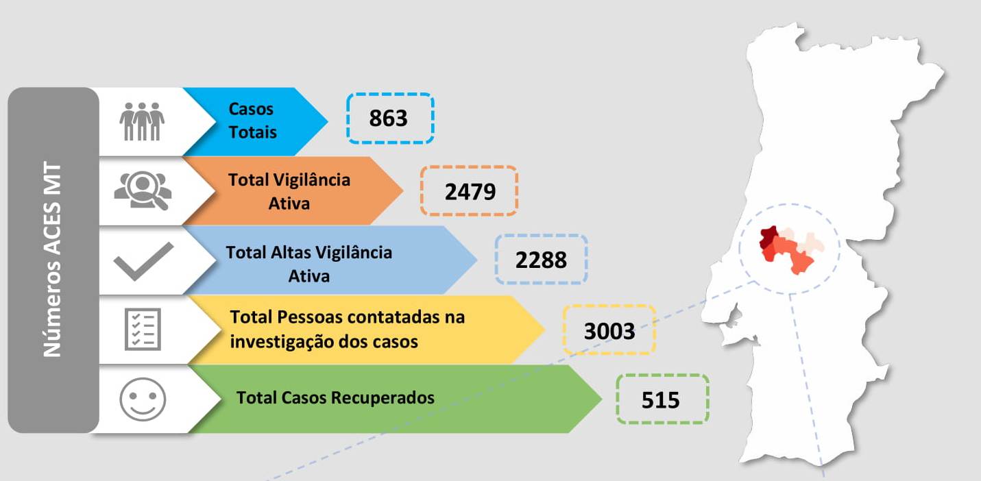 Já nas vigilâncias ativas a saúde Pública do Médio Tejo tem neste domingo 230 pessoas em confinamento por terem tido contactos próximos com outras pessoas que acusaram positivo nos testes feitos ao SARS-COV-2. Estas vigilâncias estão localizadas em Abrantes (18), Alcanena (4), Constância (13), Entroncamento (49), Ferreira do Zêzere (5), Mação (3), Ourém (53), Sardoal (2), Tomar (34), Torres Novas (46) e Vila Nova da Barquinha (4).
