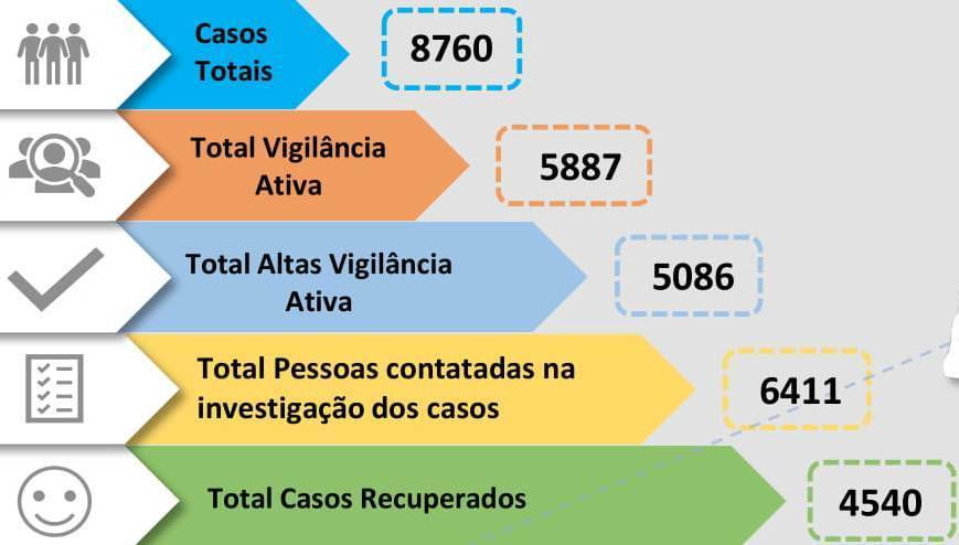 No que diz respeito às vigilâncias ativas tem estado a diminuir, sendo hoje 828, mas deverá estar refletido a ausência dos relatórios epidemiológicos, por dificuldades de recursos humanos como tem sido assumido pelo governo português.