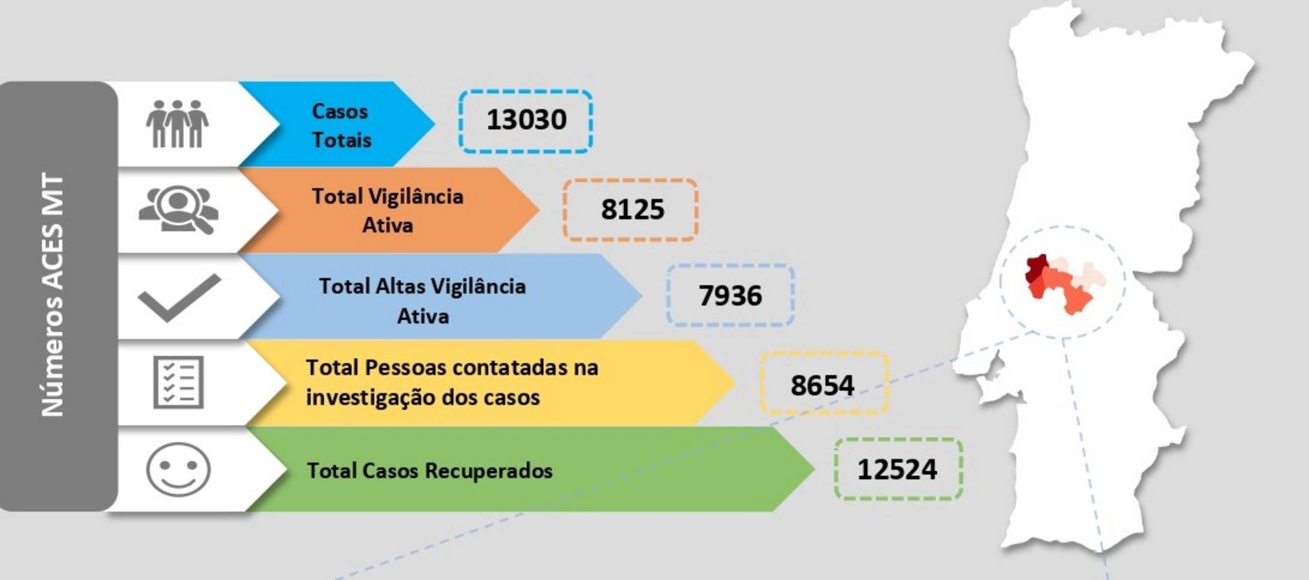 As 194 pessoas em vigilância ativa estão confinadas em Abrantes (91), Alcanena (20), Constância (5), Entroncamento (13), Ferreira do Zêzere (1), Mação (5), Ourém (11), Sardoal (9), Tomar (5), Torres Novas (8) e Vila Nova da Barquinha (26).