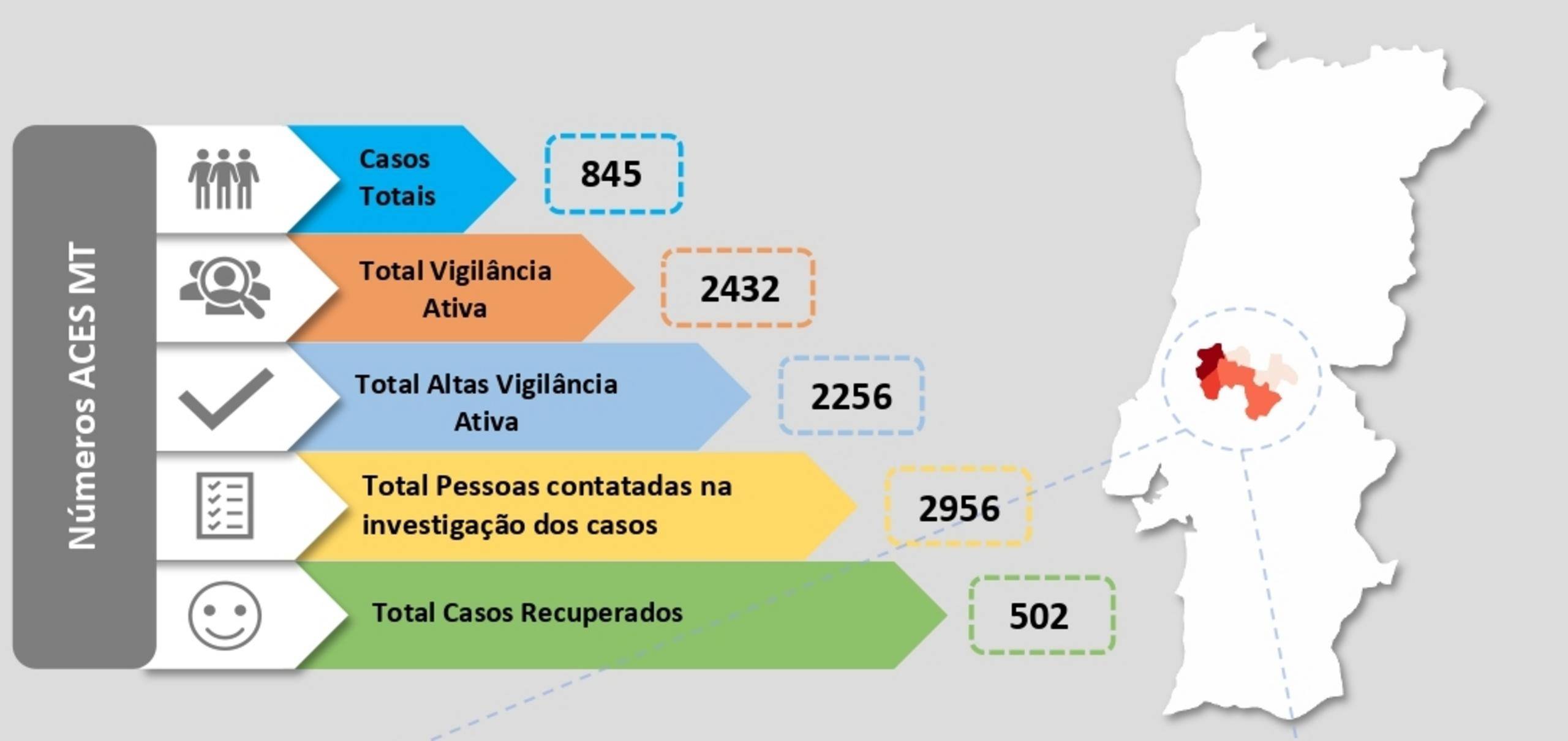 Também no que diz respeito às vigilâncias ativas, a saúde pública do Médio Tejo não regista qualquer alteração, permanecendo em vigilância 215 pessoas. Estas pessoas que têm obrigação de isolamento profilático estão localizadas em Abrantes (22), Alcanena (13), Constância (11), Entroncamento (39), Ferreira do Zêzere (5), Mação (3), Ourém (40), Sardoal (2), Tomar (31), Torres Novas (43) e Vila Nova da Barquinha (6).