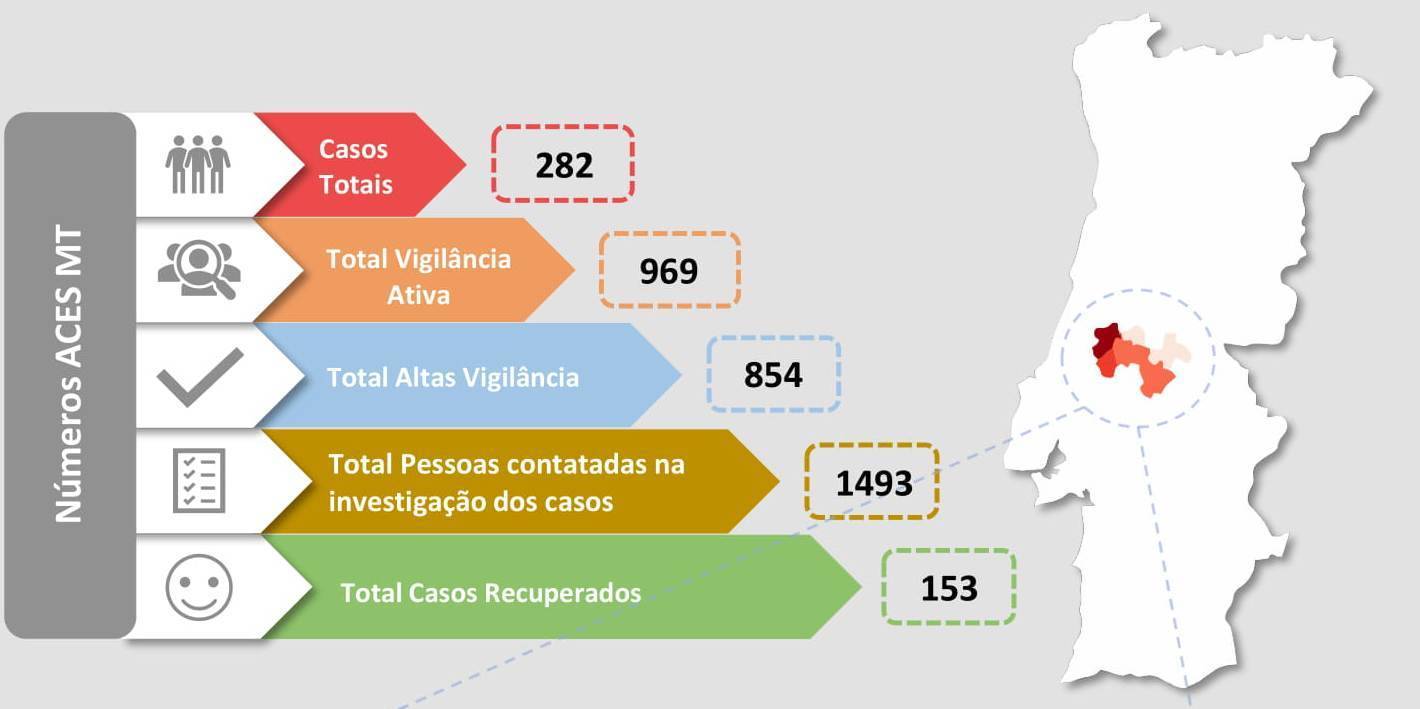 Segundo o relatório epidemiológico da Unidade de Saúde Pública do Agrupamento de Centros de Saúde do Médio Tejo há a somar ainda mais sete novas vigilâncias ativas, mas em contraponto há mais sete altas do isolamento profilático. Hoje há um total de 117 pessoas que estão a ser seguidas pelas autoridades de saúde pública porque estiveram em contactos com pessoas que testaram positivo ao SARS-COV-2.