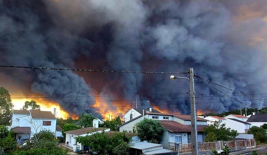 O fumo intenso é bem visível no concelho de Leiria, a cerca de 25 quilómetros, onde a escuridão do céu faz lembrar um dia de inverno chuvoso.