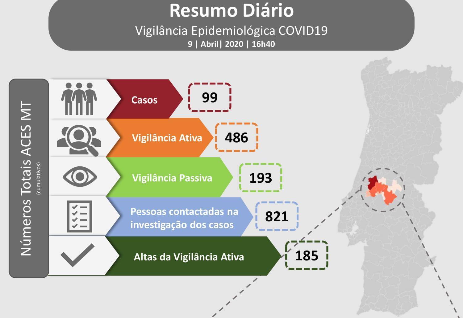 São agora 99 os casos de pessoas infetadas com o novo coronavirus na área do agrupamento de Centros de Saúde do Médio Tejo. Nas últimas 24 horas registou-se um aumento de mais sete casos positivos em Ourém (1), Tomar (2), Torres Novas (2), Vila Nova da Barquinha (1) e Mação (1). Aliás, Mação era o único concelho do ACES Médio Tejo que não tinha nenhum caso positivo. De refriri que não se trata do presidente da Câmara Municipal de Mação que estava em ilolamento. Vasco Estrela fez hoje o teste e o resultado foi negativo (Pode ler AQUI)